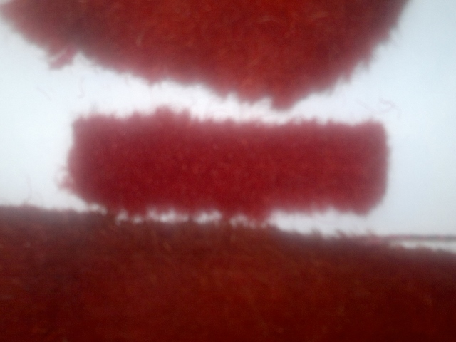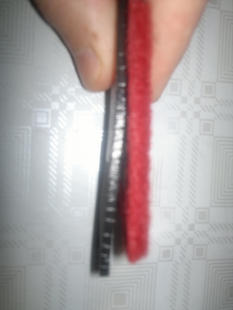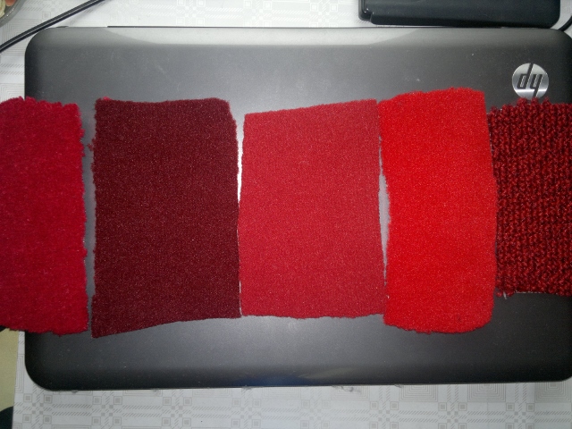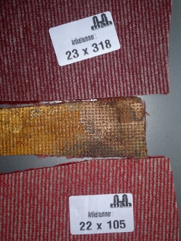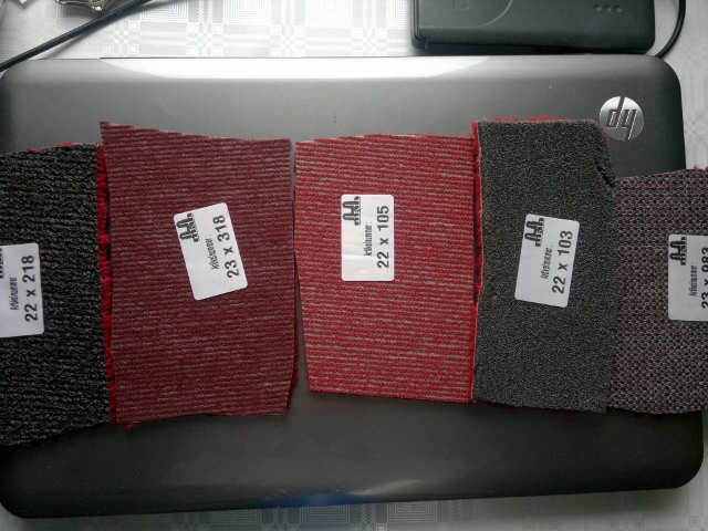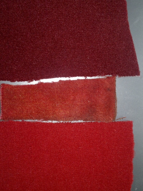 Colour selection for red tufted carpet, all except the most right one are cut pile. Identification numbers for samples and colour and backing combinations. Backing/surface colour combinations are as given in the photos. Only foam backing on 22 x 103 is optional selection, which means 22 x 103 is also available with similar soft backing as seen by 23 x 318 and 22 x 105. (22 x 108 is with black latex backing, and 23 x 983 loop pile carpet comes with sturdy through looped backing material.) Original carpet between the soft backed MAH options (23 x 318 and 22 x 105). In my opinion, 22 x 105 is very near original Triumph tufted cut pile carpet specification for rear floor and sill wall linings. For rear floor carpet, underfelt would need to be sewn on the back side with help of edge trims. This carpet material could be glued straight to inner sill walls, and where a dense and easily formable short pile carpet is needed.