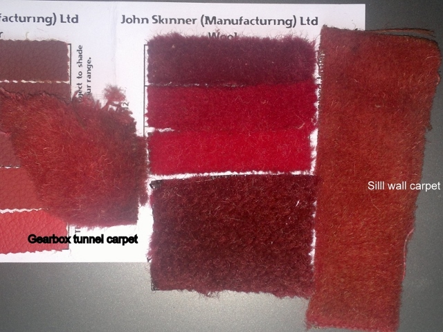 Second photo shows tufted carpet samples from J. Skinner compared to pieces of gearbox tunnel carpet and sill carpet. Hard to say what would be acceptable, if anything. Anyway, original material is denser and it came with soft secondary backing (no latex, no plastic) for rear floor and sill linings.
