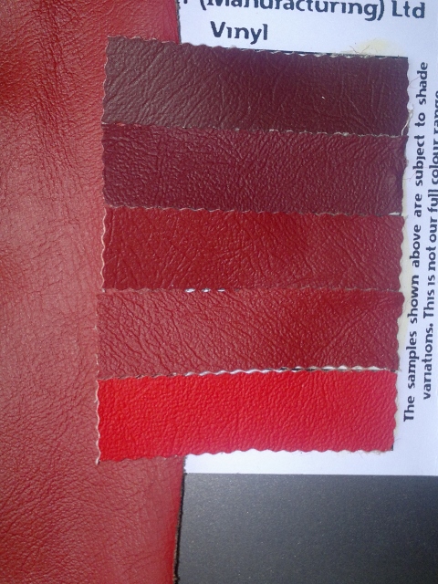 First attached photo shows vinyl samples from J. Skinner compared to one original piece. "New matador red" seem to be closest (2. sample from bottom). Graining is a bit coarser tan original.
