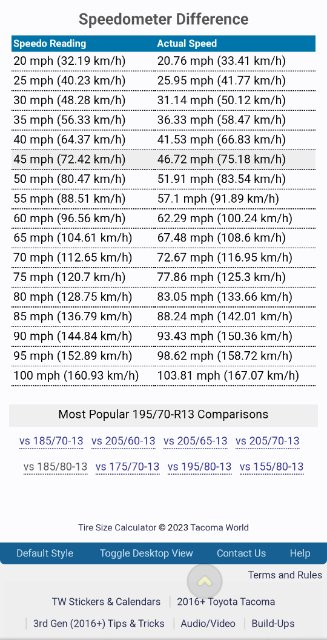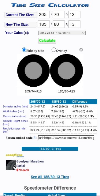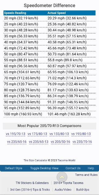 Here are details from a 'alternative tyre size website' which gives the differences in physical size, measurements and speedo throwout.
