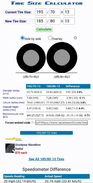 Just for comparison purposes, here are the details of a 195 70 13 tyre, which as you can see is greatly different to the original tyre size of 185 80 13, and is not suitable in my opinion as an alternative.